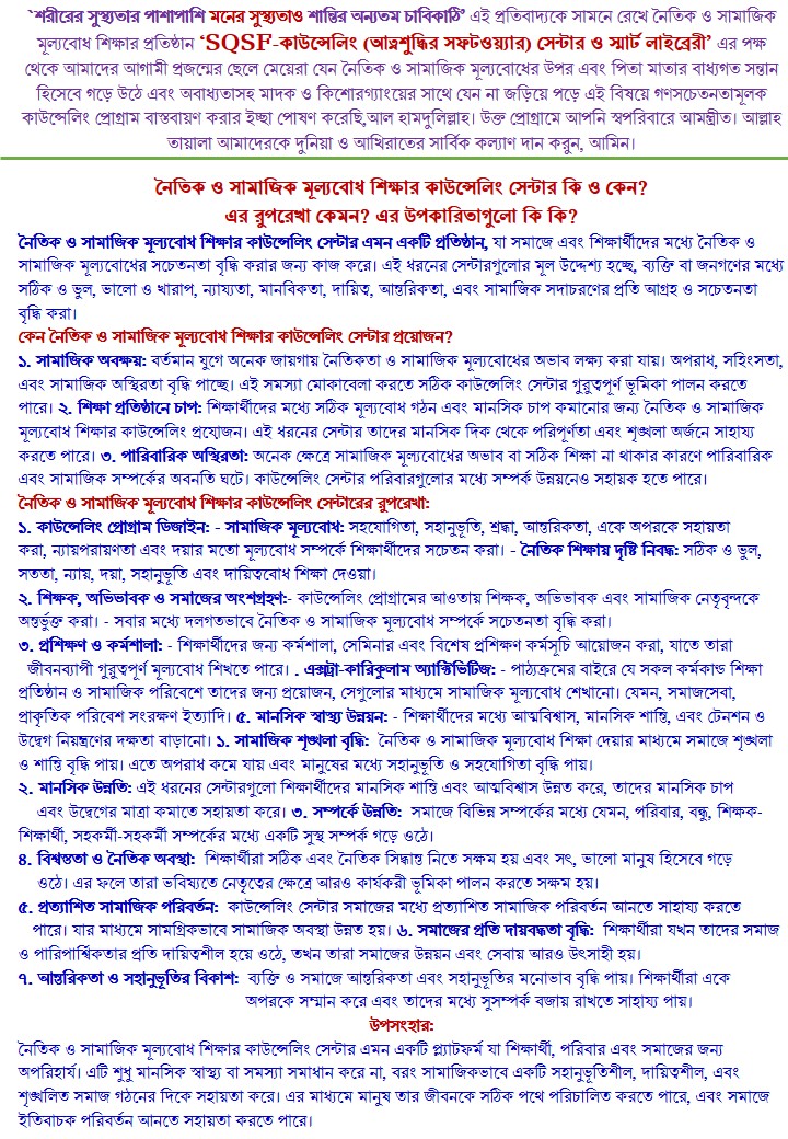 ১. আদর্শ সন্তান-শিক্ষার্থীদের জন্য -SQSF স্মার্ট লাইব্রেরী ও কাউন্সেলিং-আত্নশুদ্ধির সেন্টার।