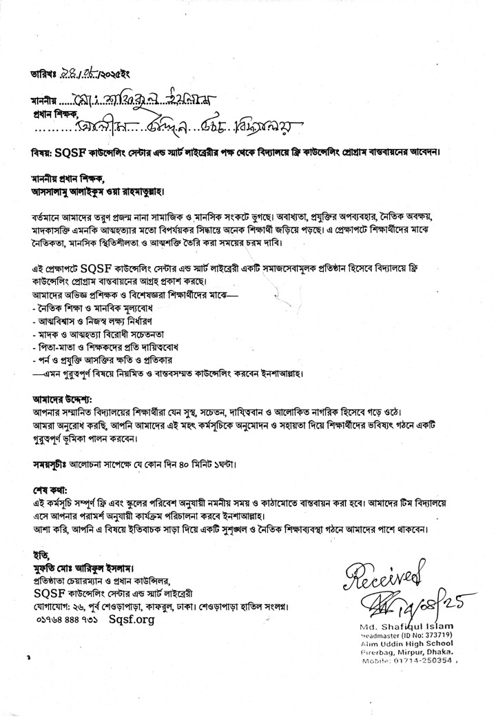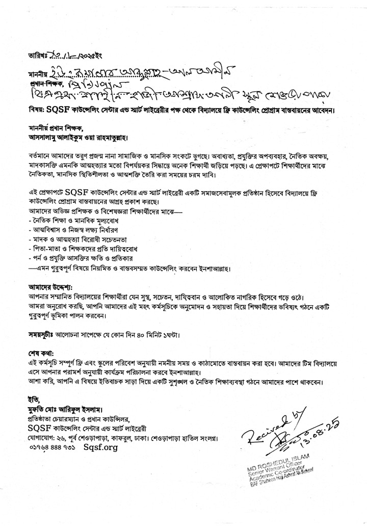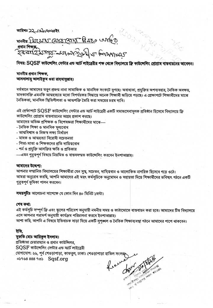 বিষয়: SQSF কাউন্সেলিং সেন্টার এন্ড স্মার্ট লাইব্রেরীর পক্ষ থেকে বিদ্যালয়ে ফ্রি কাউন্সেলিং প্রোগ্রাম বাস্তবায়নের আবেদন।